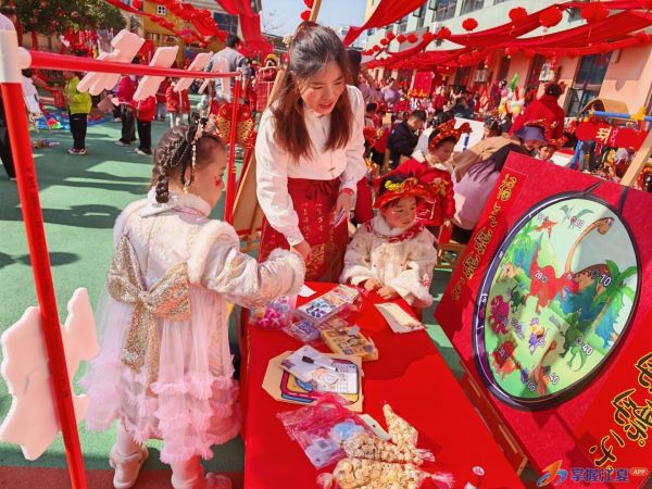 游园闯关环节精彩纷呈,家长化身“掌柜”与引导员。孩子们手持“集福卡”穿梭于各摊位,投壶、套圈,尽享竞技之趣;剪纸、做手串,感受巧手之乐;品尝传统点心,收获味蕾之享,每完成一项挑战即可集一枚福字印章。