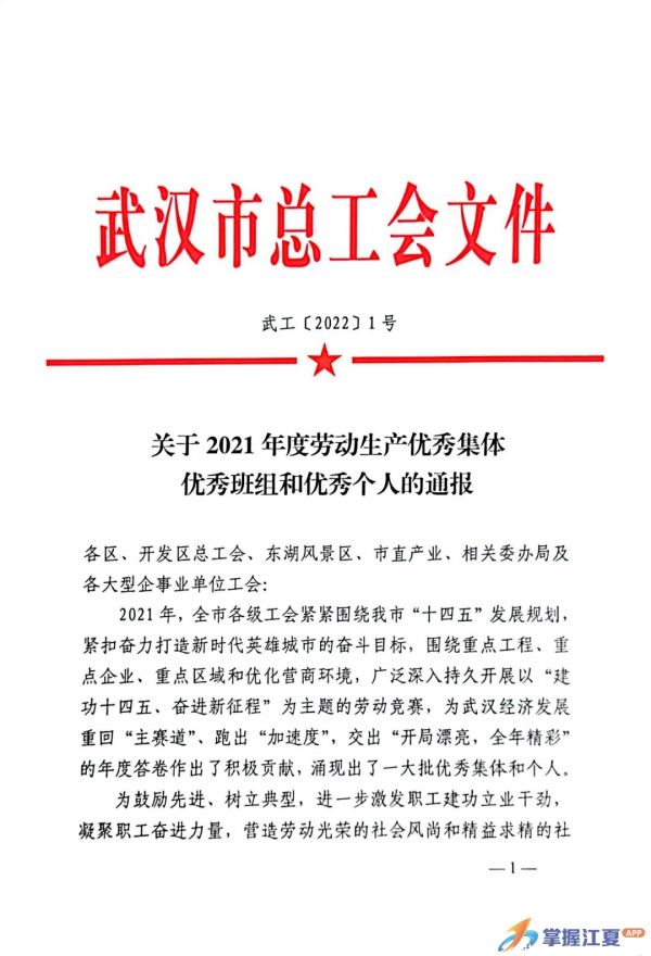 ◇ 【喜讯!江夏这一人荣获2021年武汉市五一劳动奖章荣誉称号!】据了解,此次活动按照《武汉市总工会劳动和技能竞赛绩效评价办法》相关规定,武汉市劳动竞赛委员会办公室(市总工会)决定,对武汉市35个优秀集体、298个优秀班组、292名优秀个人予以通报,同时选树为武汉五一劳动奖及武汉市工人先锋号荣誉称号。其中,江夏经开建设公司总经理陈光平同志荣获2021年武汉市五一劳动奖章荣誉称号!详见>>>